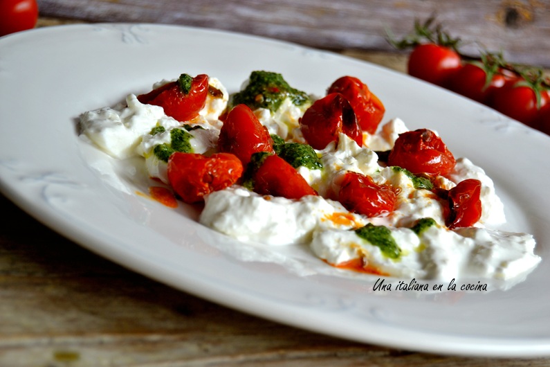 Esta receta entra por los hojos, con estos colores tan italianos a mi se me hace la boca agua solo con verla. Me encanta la burrata y acompañada con esos tomates cherry semi confitados queda deliciosa. Por no hablar del pesto que le añade un sabor y un aroma increíble. Los sabores se integran y se exaltan mutuamente.