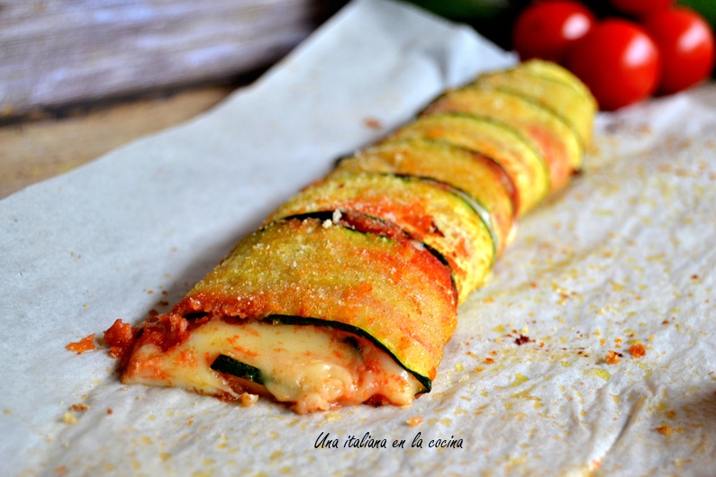 Rollo de calabacín con tomate y queso al horno, receta fácil y saludable