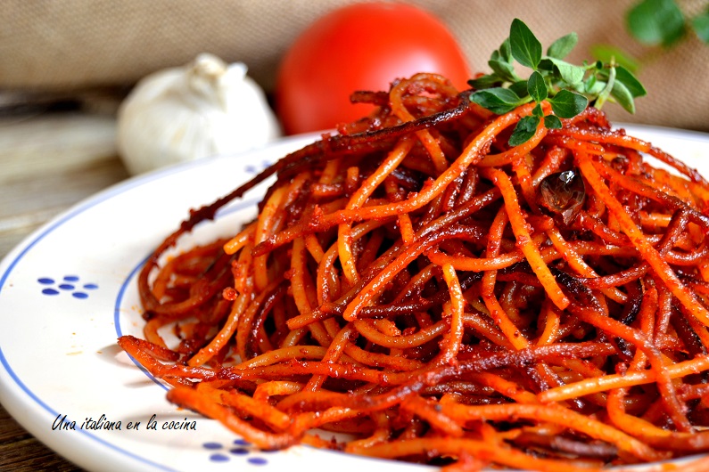 Lo peculiar de esta pasta no se acaba con lo picante que es. Te explico… Para preparar los espaguetis con salsa asesina no tienes que cocinar la pasta en agua, hay que «risottarla» es decir cocinarla como un risotto directamente en la salsa y añadir agua poco a poco. Además hay que darle un toque ligeramente quemado así la pasta queda casi tostada. Si te animas a preparar esta receta estoy segura que le cogerás el punto para que te salga irresistible. Recuerda, tiene que salir: con colores que van desde el rojo intenso, al dorado, al chamuscado, ligeramente crujiente, tostada y chamuscada y que no le falte picante.
