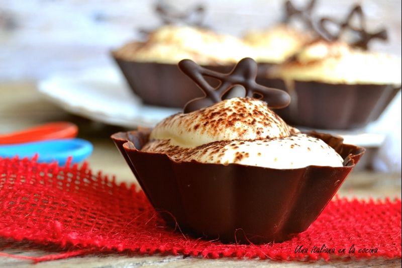 Este tiramisú en vasitos de chocolate será la perdición de muchos en estas fiestas. Es el tiramisú tradicional pero hecho con huevo entero pasteurizado para comerlo en toda seguridad. El vasito de chocolate es facilismo de preparar, no tiene complicaciones y el contraste entre el chocolate negro y el dulzor de la crema de mascarpone le da un toque aún más rico. Esta presentación es perfecta para sorprender tus invitados en los días de fiesta.