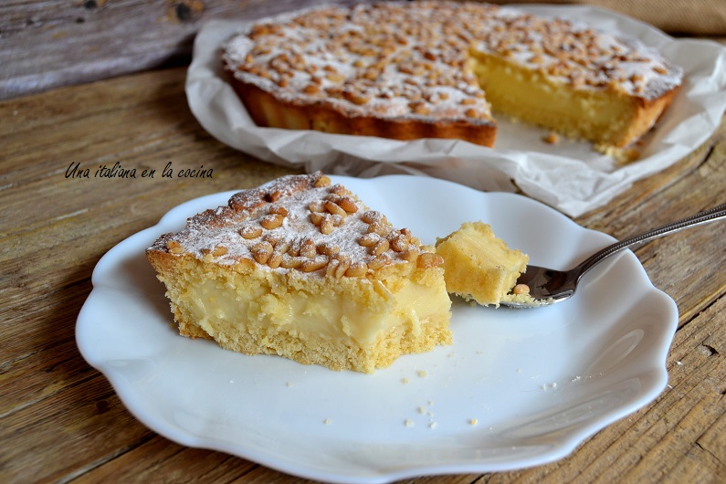 Esta receta no es una receta de mi infancia, ni de mi madre. Este postre italiano me trae los recuerdos de la universidad, cuando vivía en Perugia, y una compañera de Toscana la traía para compartirla en los descansos entre clase y clase. Recuerdo bien que lo primero que llamó mi atención fueron los piñones dorados que había encima, me encantan los piñones. Cada bocado era una delicia: el involucro crujiente, la crema fresca con sabor a limón y el aroma de los piñones. Hacía muchísimo tiempo que no preparaba esta receta y es una pena, porque queda deliciosa.